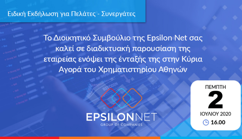 H διαδικτυακή παρουσίαση της Epsilon Net ενόψει της ένταξης του Ομίλου στην Κύρια Αγορά του Χρηματιστηρίου Αθηνών για όλους τους πελάτες της θα πραγματοποιηθεί σήμερα Πέμπτη, 2 Ιουλίου στις 16.00.